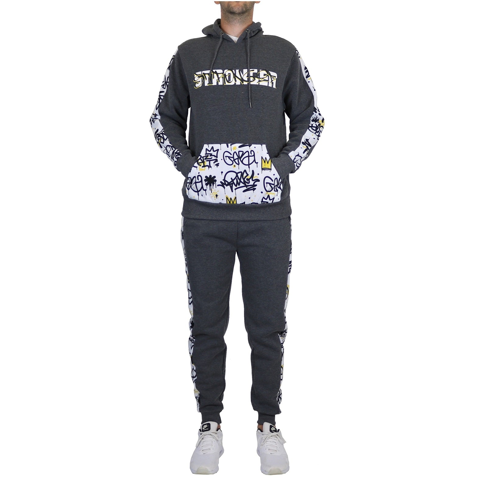 This Wholesale Men's Hoodie and Jogger fleece set in Charcoal Grey, with a front Graffiti Print that says "STRONGER" offers a powerful and fashionable option for those seeking a bold statement piece in their wardrobe. Its combination of quality, design, and message makes it a standout choice for customers looking for both style and motivation.